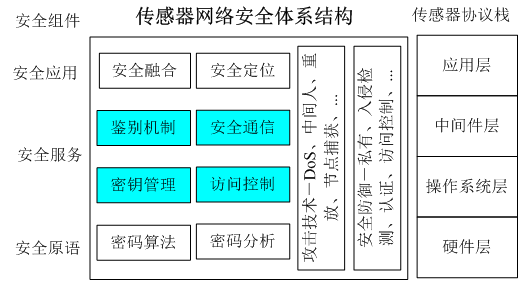 如下图所示的适用于传感器网络安全体系结构,具体包括密码算法、密钥管理、鉴别机制、安全通信、入侵检测、DoS攻击、访问控制等安全技术。