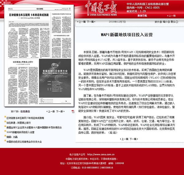 日前,多家媒体报道了新疆乌鲁木齐地铁1号线WAPI项目顺利完成验收并投入运营一事,以下是《中国电子报》的报道: