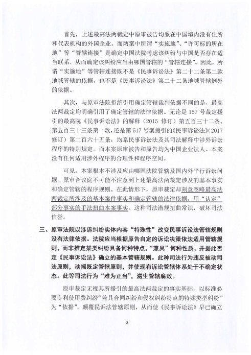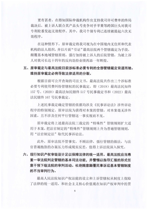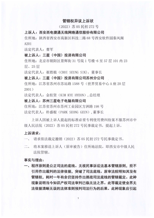 西电捷通就三星诉西电捷通标准必要专利使用费案管辖异议一审裁定(2022)苏05民初272号的上诉状原文