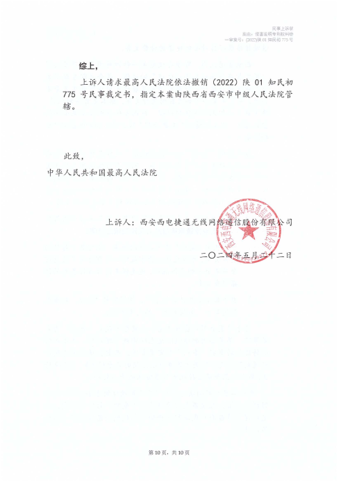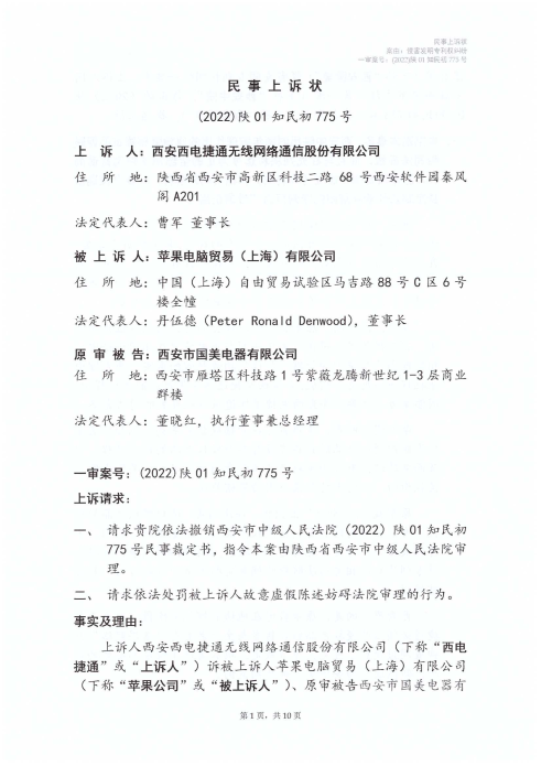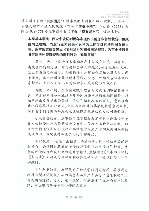 西电捷通就西电捷通诉苹果标准必要专利侵权案管辖异议一审裁定(2022)陕01知民初775号的上诉状原文